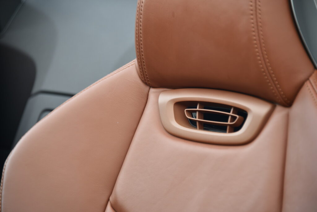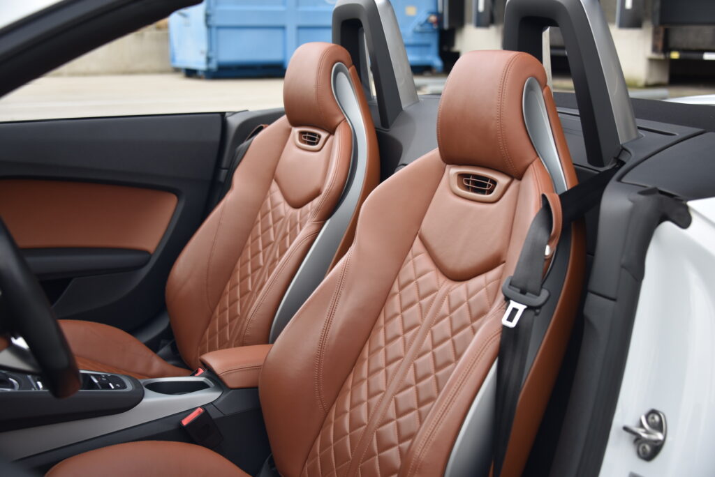 - Lederen sportstoelen in cognac kleur met gestikt ruiten patroon